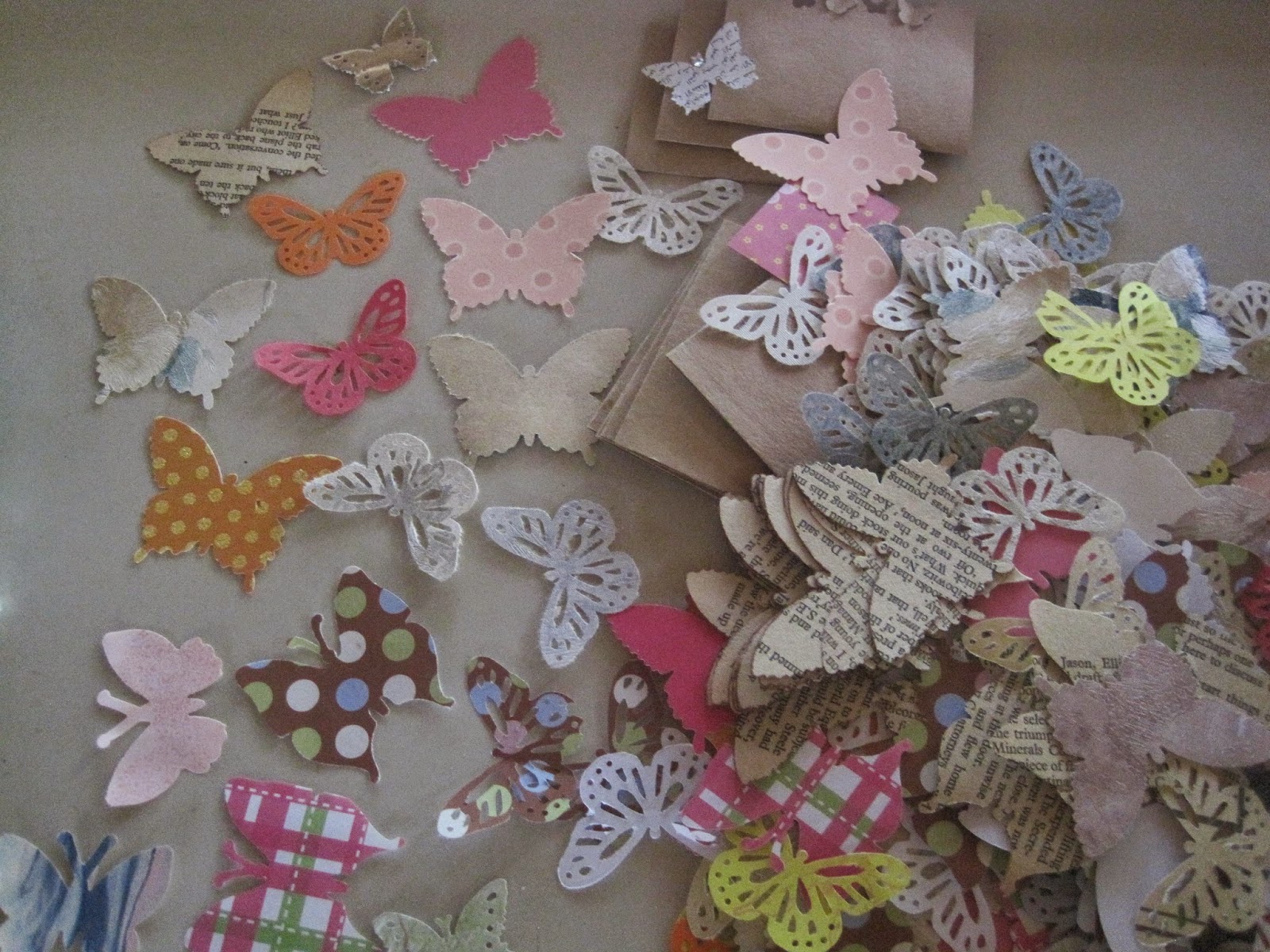 The large country butterfly (upper right) is already made in China. To my surprise, the cut was crisp, clean, and quite easy. This is not to say the others were not, but it punched through a plastic-kind-of-paper... like the gift bags materials. So, below, you'll find the various butterflies that came from the scrap papers.