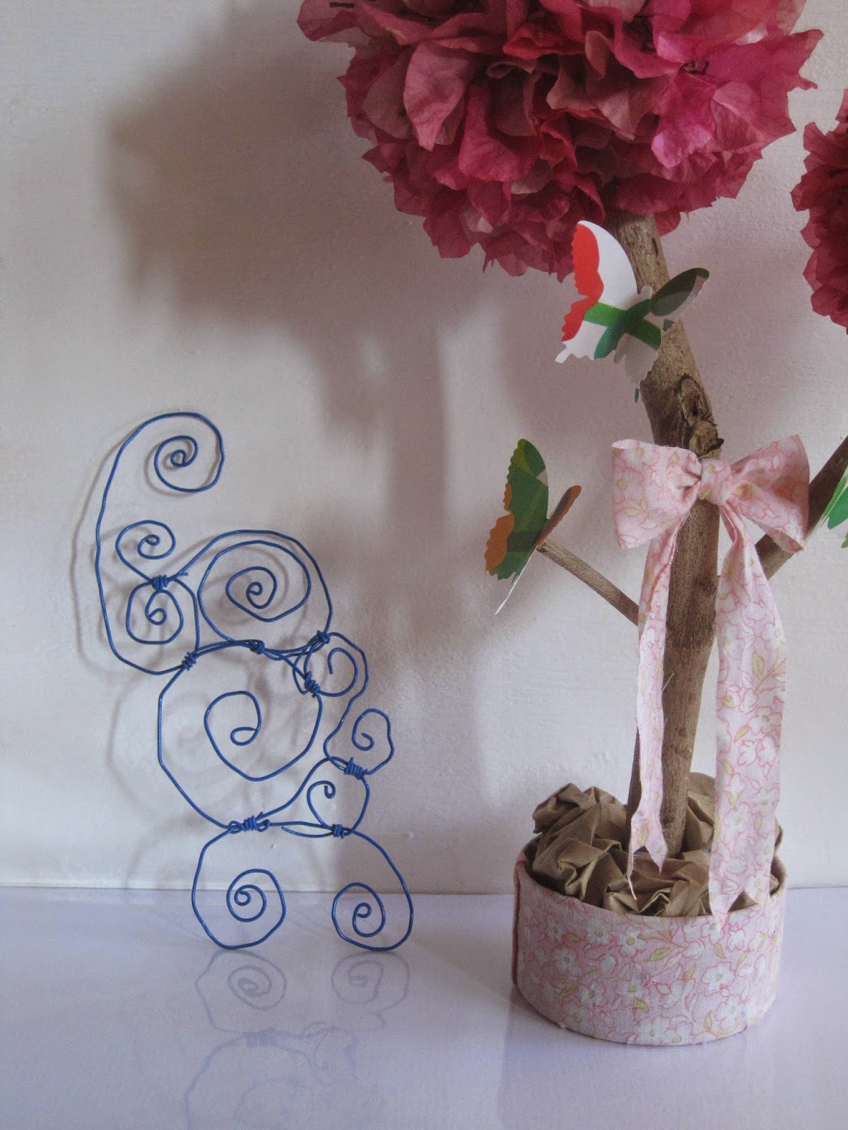 twigs & fallen bougainvillea... and scrap paper. Crumple the paper into a ball, then secure with glue-gun on edge of the twig branch. Then, glue-gun the dried flowers with a drop of glue on the bottom of each flower. Finish at the bottom side first going on the top.