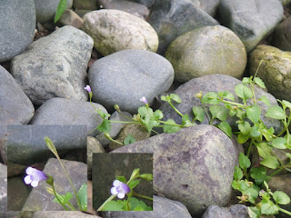 These first 3 are crawling small plants with teeny-tiny lavender flowers. They are probably called weeds elsewhere, but not for me. One group, I have harnessed on the side of the cottage wall, the other two groups are too delicate to "mind" so, I just let them spread all over the pebbles.